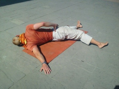 3. Roll to the right slowly by bringing your left thigh over and keeping your shoulder in place,exhaling during movement. (focus on: torso, back and left hip)