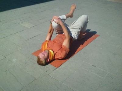 1. Grab right instep with right hand and pull heel towards chest, exhalng as you pull. To intensify, turn your torso to the left and repeat breath. (focus on: right hip)