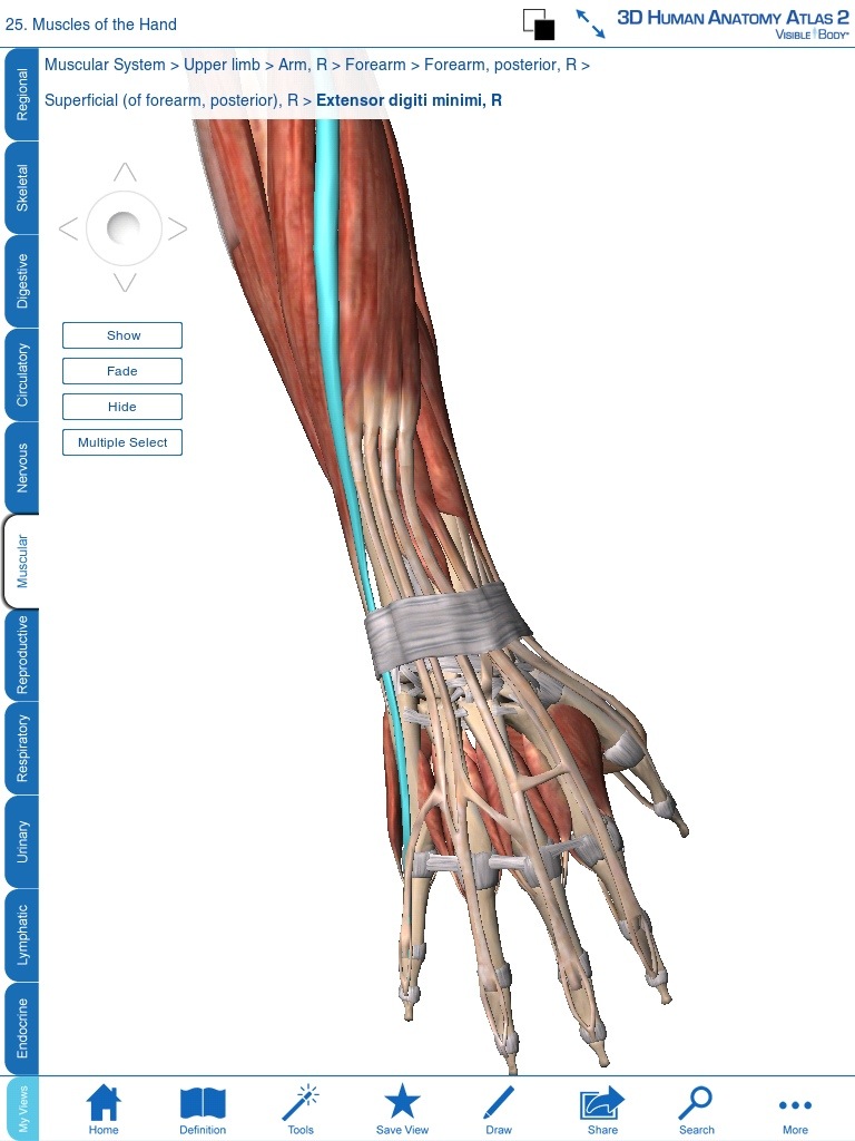 The extensor digiti minimi muscle is highligted in blue. Although the primary action of this muscle is to straighten the pinky, it has a slight pull outward on the pinky that manifests when the third palmar interosseus is not functining (Wartenberg’s sign). Notice that the extensr digiti minimi attaches far up on the forearm with a much more proximal nerve supply (radial nerve.)