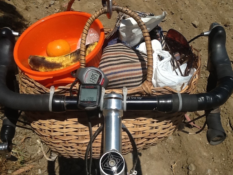 3. The seat was already at its lowest height and the handlebars at their highest. This arrangement was aerodynamic and shifted more weight to the front wheel and off the overburdened back wheel, but unfortunately placed a fair amount of my weight on my hands.