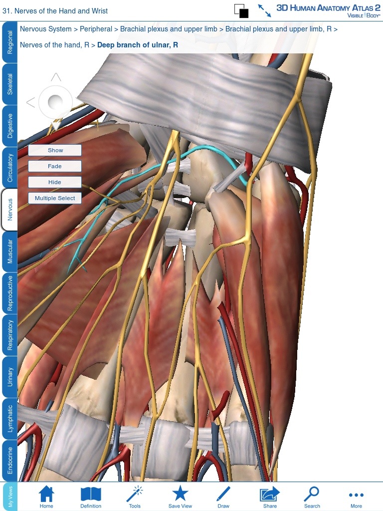 Here you can see the deep branch of the ulnar nerve highlighted in blue. It has a fairly roundabout pathway and passes right under the heel of the palm on which I was bearing weight while biking.