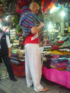 Me learning to don the blanket from a textile vendor in the market. You put your load in the blanket (in this case a yoga mat) and fold the bottom corner over the load. To make it more secure you make a deeper folding taking up more of the corner.
