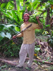 A banana chopper I made by lashing my machete to a long pole. No climbing necessary. Notice my long sleeve shirt, long pants, socks and shirt on my head all to reduce the amount of skin area exposed to biting insects. When the temperature was around 80F, the question of comfort was more more like pick-your-poison: Would you rather be hot from wearing long sleeves, or be attacked by biting insects? I chose the heat option. I never quite got used to the feeling of being bitten. I always took it too personally.