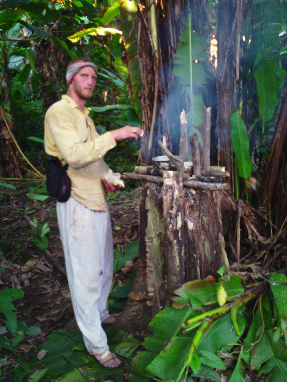 Me in front of the fire I build on top of a stump because my back was aching while bending over at fires on the ground. It worked well for the first round of food but eventually fell apart.