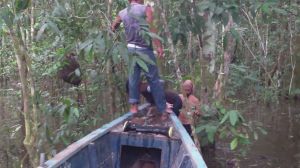 Raul at the front of the boat, sporting the soaked jeans he has been wearing all day and preparing to enter the flooded forest with us again in search of a macaw clay lick.