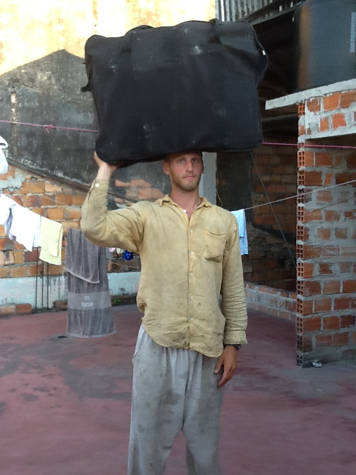 Me at with box-full-o-tandem-bicycle on my head. I suppose I could hire people to carry it around for me but taking more of the burden on myself makes me feel more abled. See my post on the