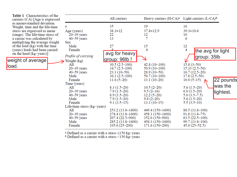 - Many of the people interviewed who carry heavy loads on their head report that it hurts their back or neck. (Siddarth 2010, Llyod 2010, Geere 2010).
