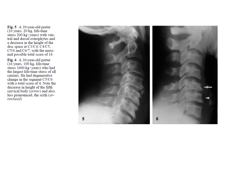 - Cervical spine degeneration has been documented at a young age in coolies and porters who regularly carry heavy loads on their head (Siddarth 2010, Jager 1997, Jumah 1994, Echarri 2002)