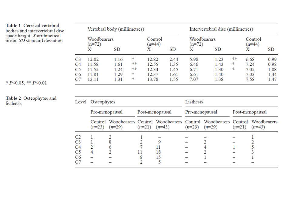 -Evidence of osteoarthritis on CT scan in the first two vertebrae of the neck was 91.6% in a group of 107 head-loading Indian porters (AVG age 32.6yrs) but only 6.8% in an Indian control group (people who came to the doctor for sinus infections, AVG age 34.6yrs) (Siddarth 2010)
