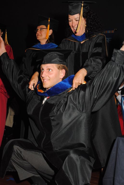 Me deep squatting to receive my hood for my doctor of physical therapy degree.