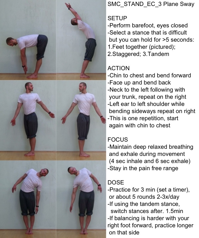 When balance is poor and I am not suspicious of an inner ear (vestibular) problem, I prescribe balance exercises. (I’ve seen young people after motor vehicle accidents who have pain throughout their spine and significantly impaired balance.)
