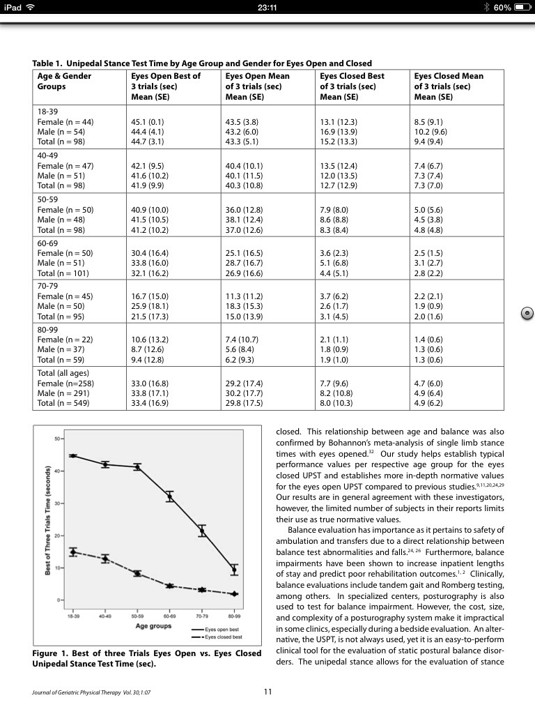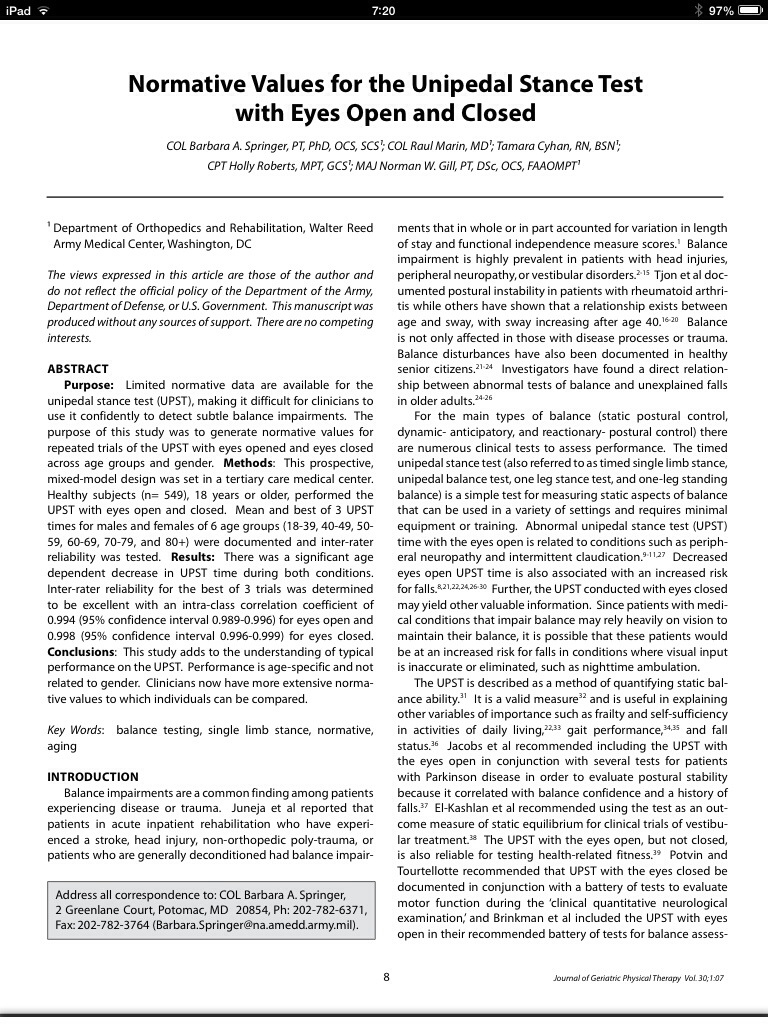 One day a patient of mine challenged the 30 second standard and so I looked it up. The best study I found was published in the Journal of Geriatric Physical therapy by lead author Barbara Spriger PT,PhD,OCS,SCS titled Normative Values for the Unipedal Stance Test with Eyes Open and Closed. This study tested single leg balance in 549 people at the Walter Reed Army Medical Center in Washington DC. The subjects were recruited by a flyer posted in the waiting room.  Subjects were excluded if they had any known history of balance impairment, were pregnant, had a lower extremity or lumbosacral condition requiring medical care or peripheral neuropathy.