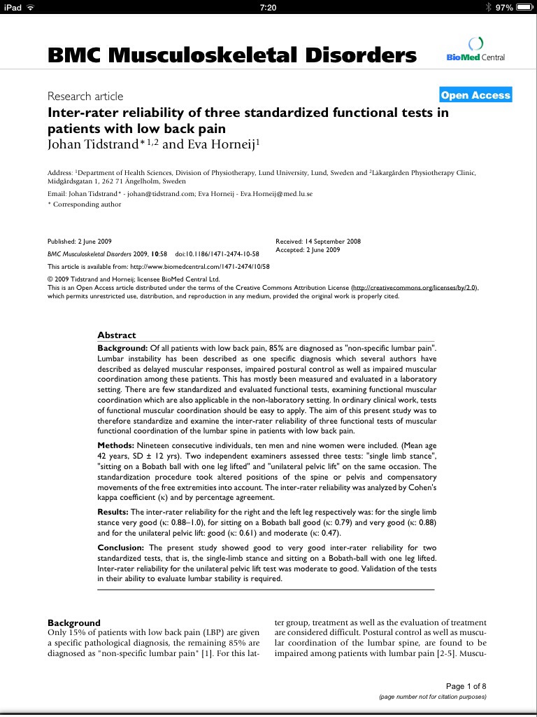 The springer study strictly measured the length of time the subjects were able to stand on one leg. Many people who study the musculoskeletal system contend that  the way you stand on one leg is important as well. One example of this is Johan Tidstrand and Eva Harneij’s study in 2009 on the “inter-rater reliability of three standardized functional tests in patients with low back pain”  where they graded the amount one leans over when standing on one leg.  More lean suggests more lumbo-pelvic instability. Their study found it was a reliable test, it remains to be proven how well this test can predict outcomes or direct treatment effectively.