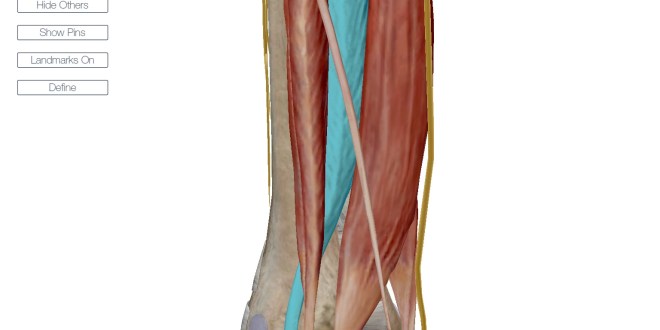 The tibialis posterior tendon is highlighted in blue. Notice how the thin tendon loops around the arch of the foot and holds it up. Screenshot from Visible Body Muscle Premium for ipad