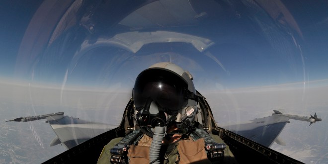 F-16 Pilot looking over his shoulder to “check his 6 o’clock”- the posture most reported as painful by pilots.